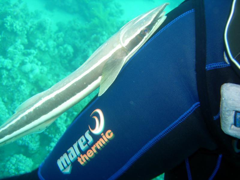 La Remora "bianca" o Remorina albescens è dotata di una ventosa sulla testa, si attacca ad altri pesci, soprattutto squali balena e mante. A volte la si incontra mentre nuota sola, alla ricerca di chi la ospiti, come in questo caso, che si è attaccata a Fabrizio per tutta la durata dell'immersione, spostandosi lungo tutto il suo corpo infastidita dalle mie foto. |